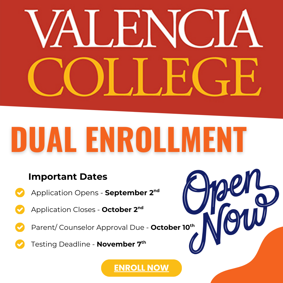 Use this quick link to the application, application instructions, and links to virtual information sessions if interested: Valencia College Dual Enrollment ApplicationIf you are interested in applying for Valencia DE, please use the link below to sign up for the PERT exam: Optional Exam Signup Form